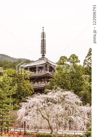 春の京都 醍醐寺 霊宝館の枝垂れ桜と十三重石塔