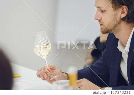 Wine expert holds a glass of wine, looks at tint and smells flavor, degustating