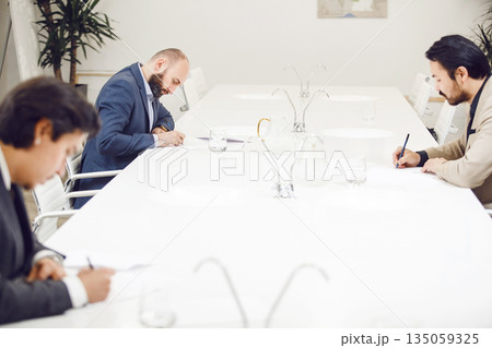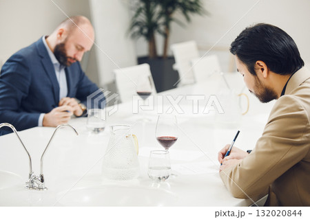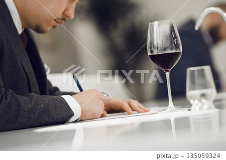 ProfessionalFaceless Sommelier Evaluating Red Wine by Tasting it and Making Notes to Wine Card of Participant. Wine study school, winemaking lecture.