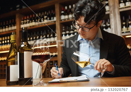 Sommelier Tasting White Wine While Taking Notes in Wine Cellar. Professional Wine Tasting and Evaluation Concept.