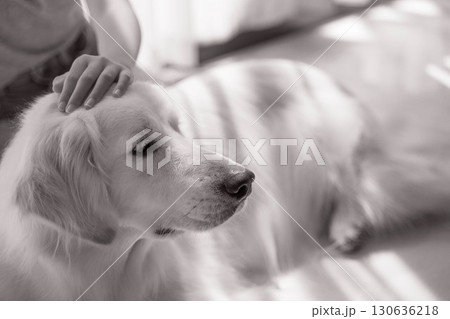 飼い主に頭を撫でられてくつろぐゴールデンレトリーバー