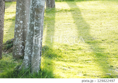 公園の芝生に映る木立の長い影