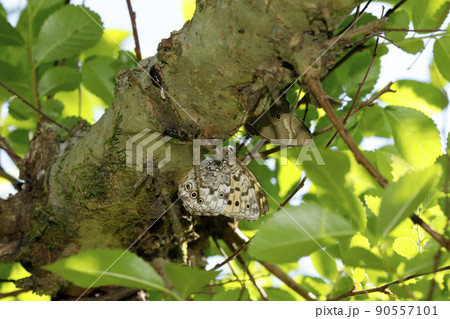 暗い雑木林の木の幹にとまるサトキマダヒカゲ蝶のカップル(自然光+ストロボ・マクロ接写)