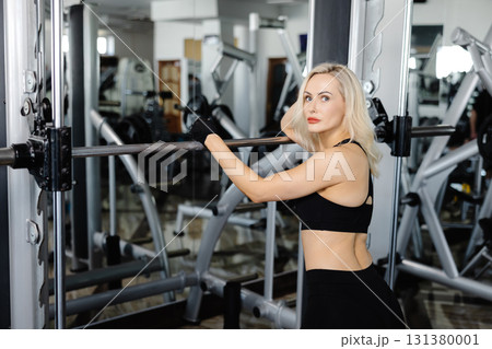 Slim body type. Young woman in fitness center is doing exercises