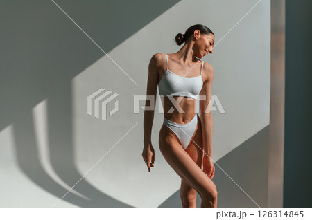 Posing for the camera. Woman in white underwear with slim body type against white background