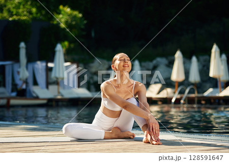 Front view. Woman near pool is doing yoga exercises