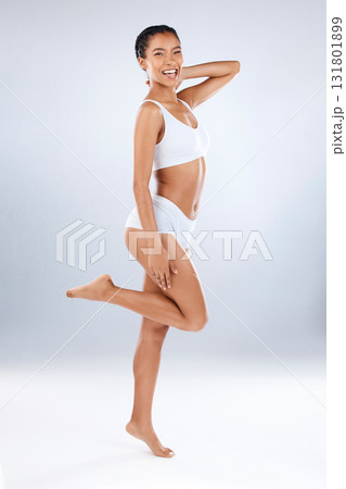 Health, happiness and body care, portrait of woman in underwear with skincare, mockup and balance in studio. Wellness, diet and excited beauty model, smile and fit figure isolated on grey background.