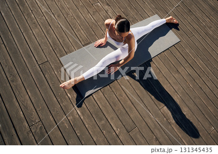 Stretching the legs. Young woman in fitness clothes is outdoors