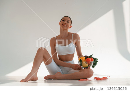 Sitting on the floor with healthy food. Young caucasian woman with slim body shape is indoors in the studio
