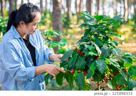 Harvest coffee bean ripe Red berries typing laptop computer check quality control plant coffee tree. Smart farmer using laptop in green coffee farm sustainable quality control agriculture technology
