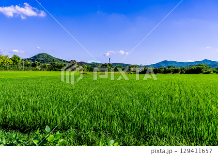 Rice. A large area of rice seedlings growing in the fields of Korea.