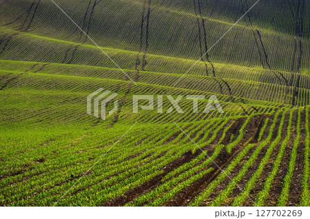 Beautiful spring landscape with field, hills and sunset. Czech Republic - South Moravia (Moravian Tuscany.) Concept for agriculture, travel, environment and nature..