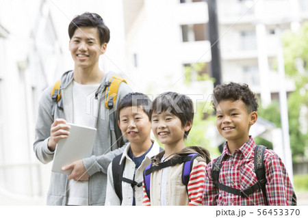 課外学習中の小学生と先生