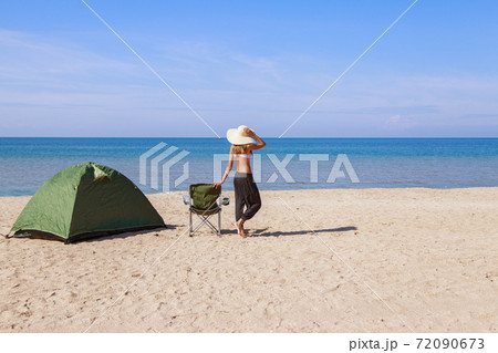 journey to the sea. camping on the beach. Vacation by the water. Men and a tent with a tourist chair on the sand