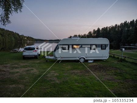 Night campsite camping caravan by lake Ragnerudssjoen in Dalsland Sweden beautiful nature forest pinetree