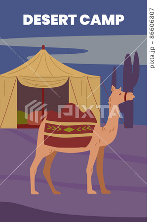 Desert camp journey banner or poster layout, flat vector illustration.