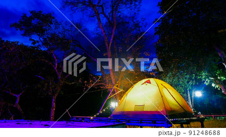 Comping tent at night in the forest.