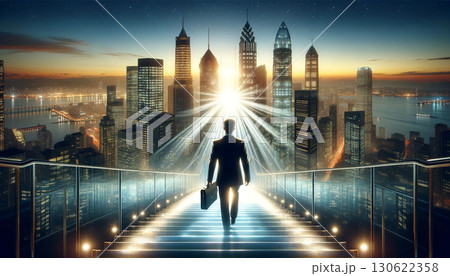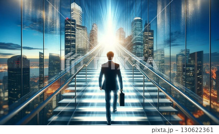 輝く未来へ向かって階段を歩く男性ビジネスマンの後ろ姿