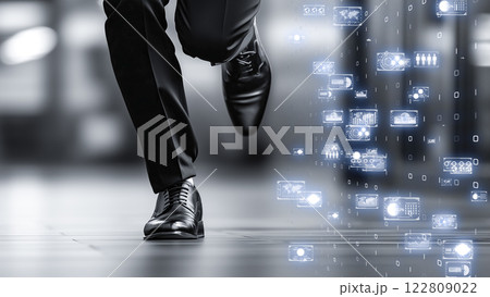 AIの未来へ飛躍する人間の姿、デジタル革新と進歩のコンセプト