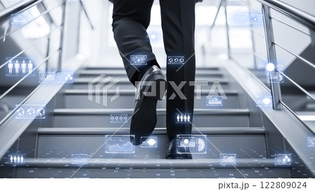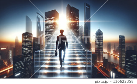 輝く未来へ向かって階段を上がる男性ビジネスマンの後ろ姿