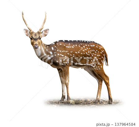 Spotted Deer standing in profile, showing brown coat with white spots, slender legs, and small antlers against a clean white background