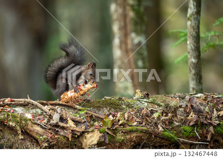 赤い松の実を食べるエゾシマリス