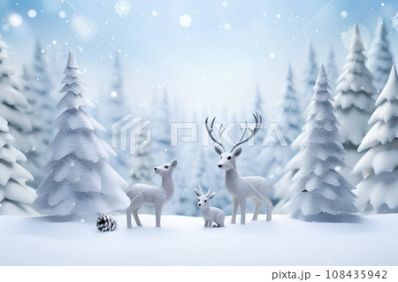 もみの木とトナカイのシルエット|冬の森の背景イラスト素材