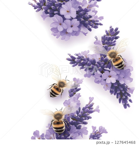 Close-up illustration of honeybees collecting nectar from purple lavender and verbena flowers on a white background. Perfect for natural, ecological, and floral-themed designs.
