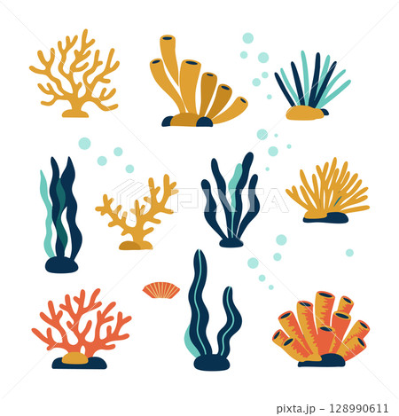 Colorful underwater coral reef elements with seaweed and bubbles vector illustration