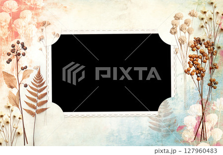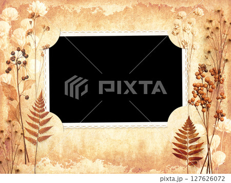Vintage album page with retro photo frame. Retro background with old blank photo, dry pressed leaves and flowers on paper texture. Nostalgic scrapbooking style. Mock up template. Copy space for text