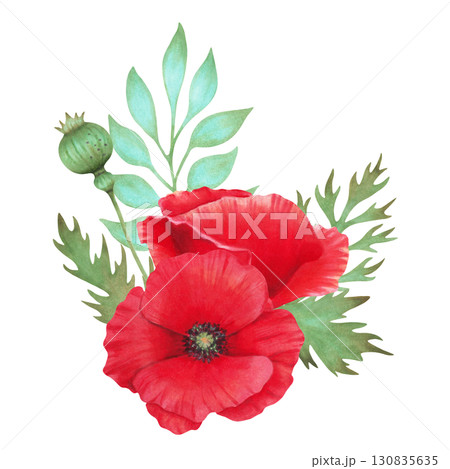 Poppy flower composition with pod, branch. Botanical watercolor, marker illustration. Hand drawn isolated work. Wild poppy festival. Spring and Labor Day. Traditional medicine cosmetology, packaging.