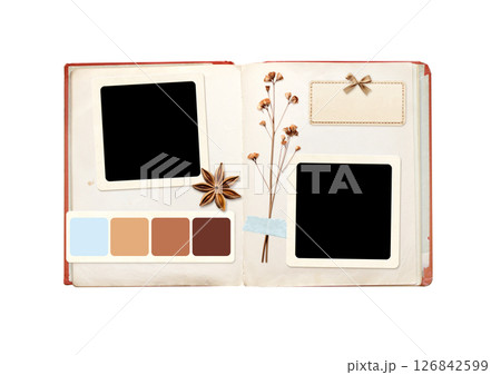 Nostalgic backdrop with moodboard pictures for scrapbooking. Horizontal background with open book, retro photo, dry pressed flowers, star anise, swatch color strip. Vintage style mood board layout