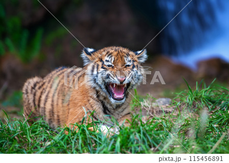 Tiger cub in the wild. Baby animal in green grass on waterfall background