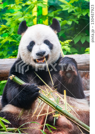 The Giant Panda Bear sits while eating a bamboo stalk