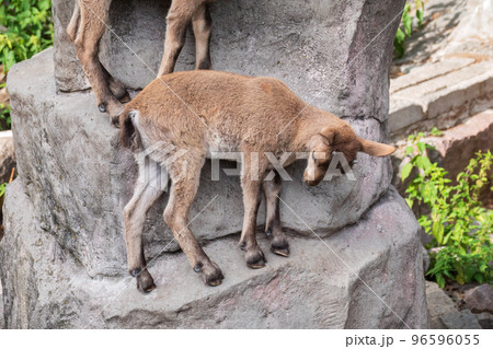 Markhor goatlings jump on the rocks. Markhor, Capra falconeri