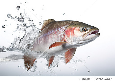 Graceful Leap Salmon in Mid-Air, Captured Against a Pristine White Backdrop. created with Generative AI