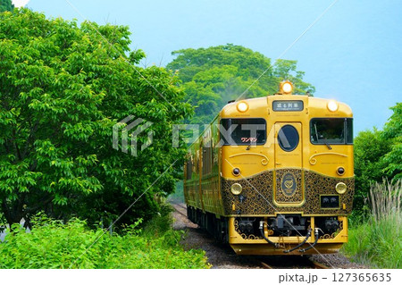 由布岳にたなびく雲と走る金色の観光列車 或る列車