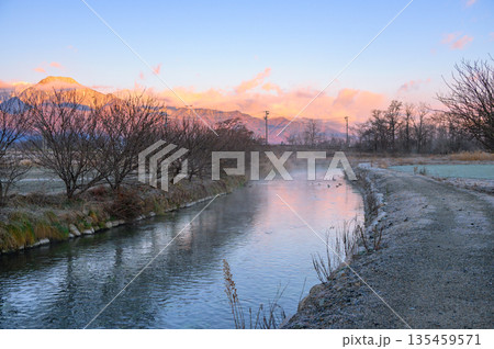 有明山モルゲンロートと蓼川とカモの群れ【安曇野市】