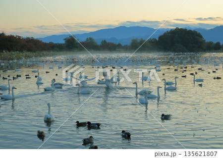 白鳥が優雅に泳ぐ阿賀野の瓢湖の風景