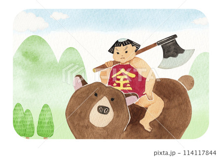 熊に乗って、まさかりかついだ、金太郎のイラスト