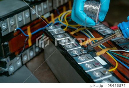 Technician use soldering iron to solder metal and wire of lithium-ion rechargeable battery. Repair module of Li-ion battery. Engineer hand holds soldering iron and tin-lead to solder electronic board.