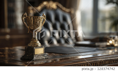Golden trophy cup on wooden desk with leather chair in background symbolizes growth success and achievement