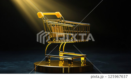 Golden shopping cart on pedestal with light beam, symbolizing best seller