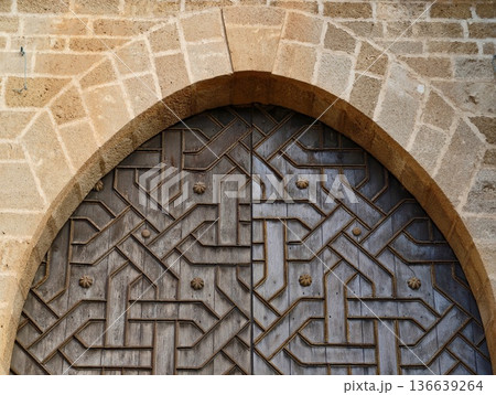 Elegant Carved Timber Door Featuring Interlocking Patterns And Stone Border For Cultural Preservation