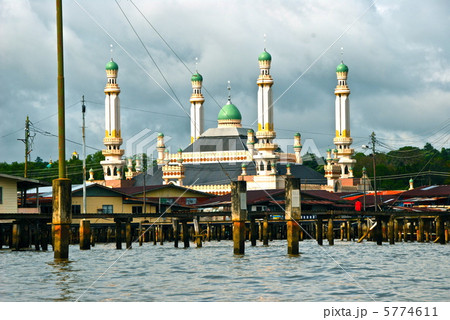 ブルネイ川・水上集落(カンポン・アイール)から眺めた「モスク」(バンダルスリブガワン/ブルネイ)