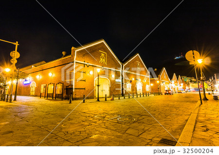 Cityscape of the historic red brick warehouses at twilight in Hakodate Hokkaido Japan in winter