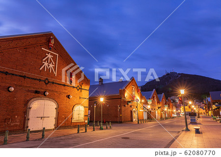 Cityscape of the historic red brick warehouses at twilight in Hakodate Hokkaido Japan in winter
