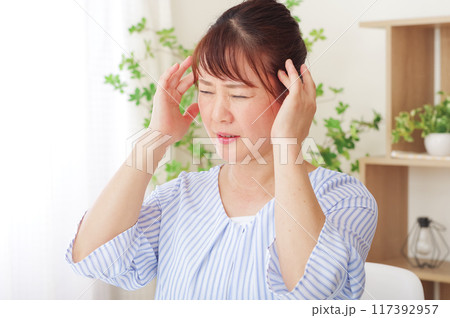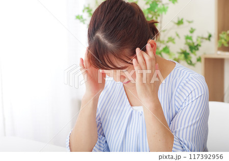 頭が痛くてこめかみを押さえるシニア女性