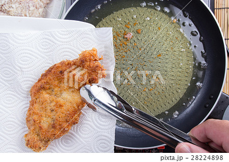 Chef keeping deep fried pork from pan