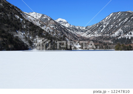 結氷した奥日光湯ノ湖に湖畔の木の影